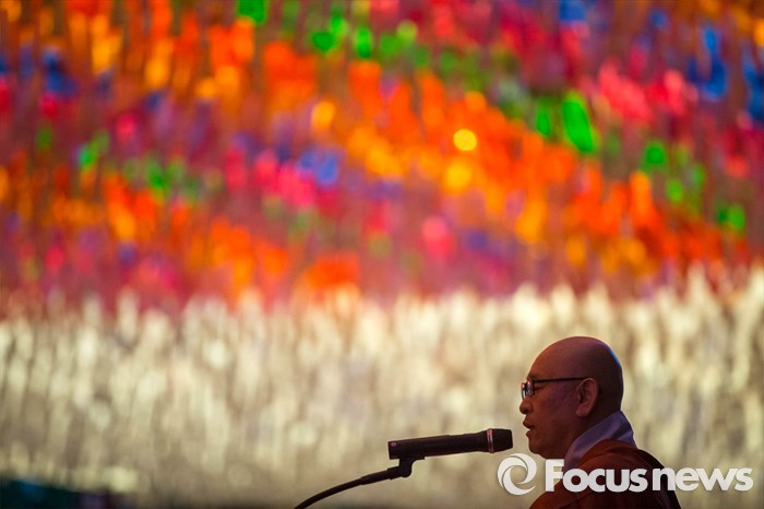 (서울=포커스뉴스) 4일 오후 서울 종로구 조계사에서 열린 연등 점등식에서 조계사 주지 스님이 축사를 하고 있다.