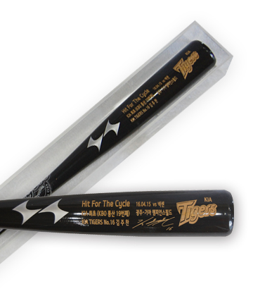 김주찬은 지난달 15일 광주 넥센전에서 한국프로야구 역대 19번째이자 구단 사상 첫 사이클링히트를 달성했다.프로야구 KIA가 김주찬 사이클링히트 기념상품을 출시했다. 사진은 기념배트. <사진제공=KIA 타이거즈>프로야구 KIA 김주찬(가운데)이 지난 3일 광주 롯데전에 앞서 사이클링히트 기념상을 받고 기념촬영하고 있다. <사진제공=KIA 타이거즈>
