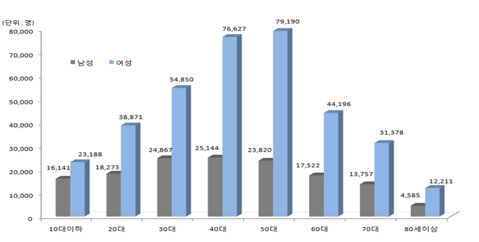 여성은 △50대(1952명) △70대(1905명) △40대(1791명) 순이었으며, 남성은 △80세 이상(1182명) △70대(1075명) △60대(738명) 순으로 나타났다.