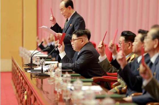 이어 "주체조선의 첫 수소탄의 장쾌한 폭음으로 뜻깊은 올해의 장엄한 서곡을 울린 국방과학부문에서 연이어 우리 국가의 존엄과 자주권을 수호하는 사변적인 기적들을 창조해 당 제7차대회 대회장의 대문을 활짝 열어놓았다"고 자축했다.북한 제7차 노동당대회가 열리고 있는 모습. <사진출처=노동신문>
