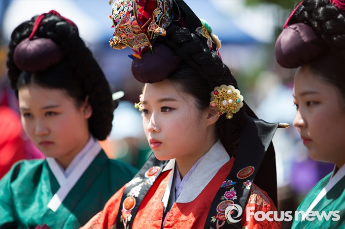 (서울=포커스뉴스) 7일 오전 서울 구로구 궁동저수지생태공원에서 '정선옹주 시집가는 날' 참가자들이 전통혼례를 재현하고 있다. 정선옹주는 조선 14대 임금인 선조와 후궁 정빈 민씨의 딸이다.