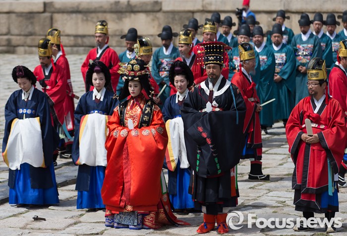 (서울=포커스뉴스) 7일 오후 서울 종묘 정전에서 열린 '조선의 세자빈 혼례를 고하다' 행사에서 참가자들이 묘현례를 재현하고 있다. 묘현례는 왕비나 세자빈이 왕실 혼례를 마친 후 조선왕조 역대 왕가 왕비의 신주가 모셔진 종묘를 알현하는 의례로서 조선시대 종묘에서 행해지는 국가의례 중 왕실 여성이 참여하는 유일한 행사이다.