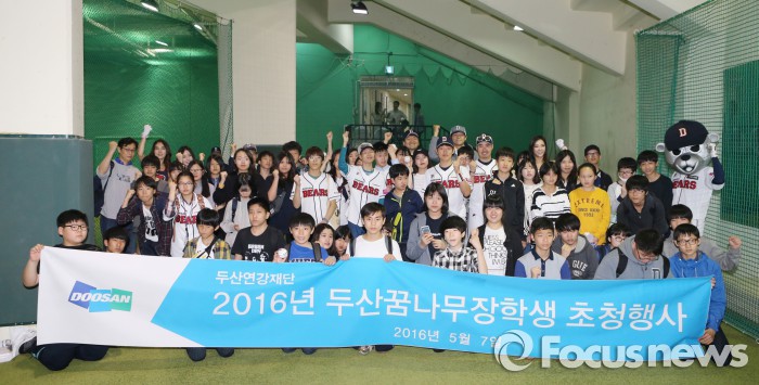 (서울=포커스뉴스) 두산연강재단은 7일 '두산꿈나무 장학생'으로 선발된 중학생 56명을 잠실야구장으로 초청해 두산 임직원과 함께 두산베어스 야구경기를 관람하는 행사를 열었다.