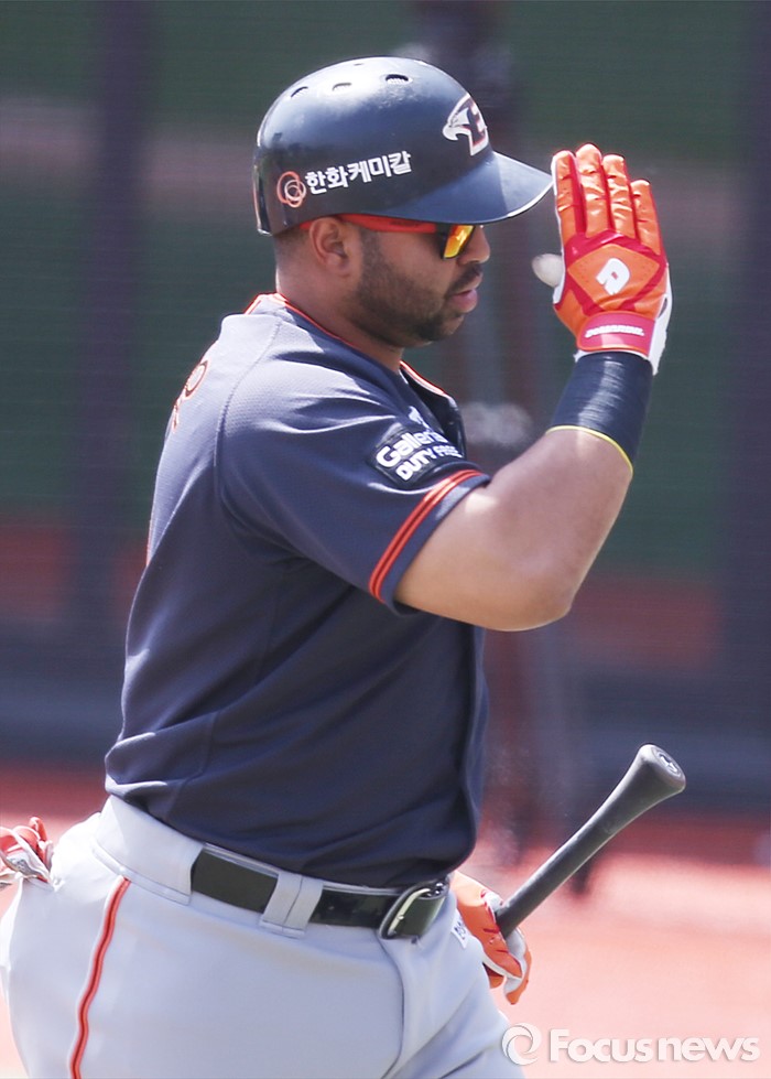 (서울=포커스뉴스) 8일 수원 kt위즈파크에서 열린 2016프로야구 한화-kt 경기 2회초 2사 1,2루에서 한화 로사리오가 좌월 3점 홈런을 치고 홈인하면서 경례를 하고 있다.