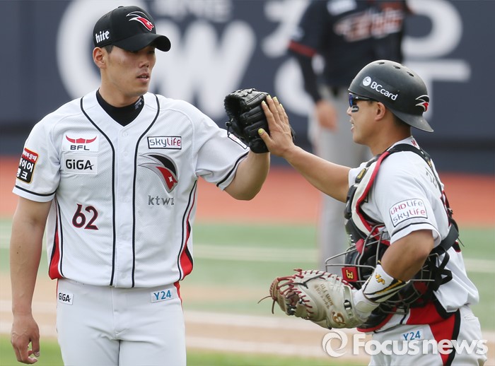 (서울=포커스뉴스) 8일 수원 kt위즈파크에서 열린 2016프로야구 한화-kt 경기에서 세이브를 따낸 kt 투수 김재윤과 포수 김종민이 하이파이브로 승리를 축하하고 있다.