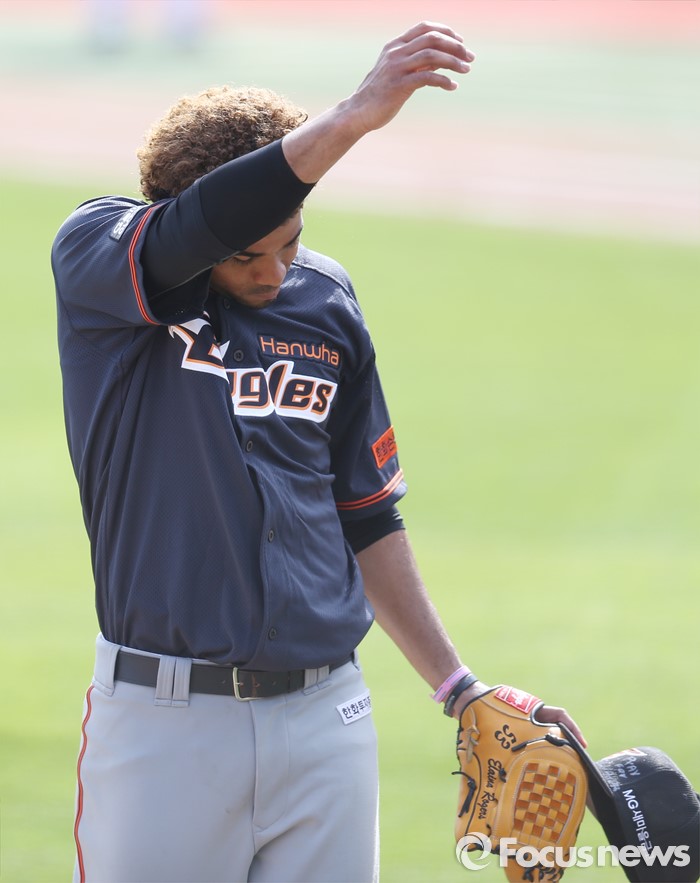 (서울=포커스뉴스) 8일 수원 kt위즈파크에서 열린 2016프로야구 한화-kt 경기에서 한화 투수 로저스가 6회 1사 2루에서 교체돼 마운드에서 내려오며 이마의 땀을 닦고 있다.