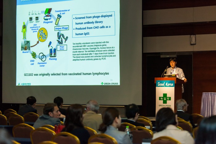 박대우 녹십자 전무는 “GC1102의 개발 속도가 관련 약물 중 가장 빠르기 때문에 세계 최초의 유전자재조합 B형 간염 면역글로불린 제제가 될 가능성 높다”며 “이 약물이 상용화 되면 기존 원료혈장의 제한적 수급 문제의 해결뿐만 아니라 글로벌시장에서 괄목할 만한 성장이 기대된다”고 말했다.송기원 서울아산병원 교수가 지난 6일 서울 강남구 코엑스 컨벤션센터에서 열린 런천 심포지엄에서 녹십자가 자체 개발중인 유전자 재조합B형 간염 항체치료제 ‘GC1102’의 임상 중간결과를 발표하고 있다. <사진출처=녹십자>