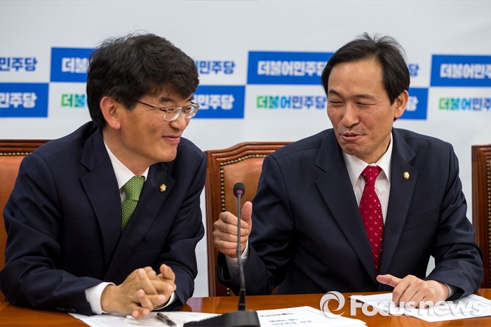 (서울=포커스뉴스) 우상호(오른쪽) 더불어민주당 원내대표와 박완주 더불어민주당 원내수석부대표가 9일 오전 서울 여의도 국회에서 열린 신임 원내대표단 회의에 참석해 대화를 나누고 있다.