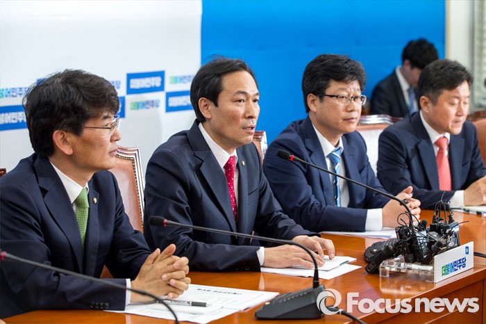 (서울=포커스뉴스) 우상호(왼쪽 두 번째) 더불어민주당 원내대표가 9일 오전 서울 여의도 국회에서 열린 신임 원내대표단 회의에서 모두발언 하고 있다.