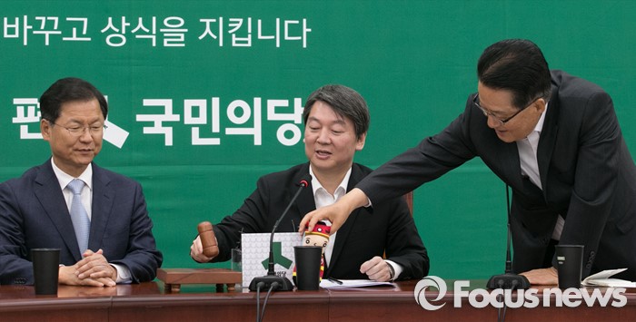 (서울=포커스뉴스) 9일 오전 서울 여의도 국회에서 열린 국민의당 최고위원회의에 참석한 박지원(오른쪽) 원내대표가 안철수(가운데) 상임공동대표의 자리에 국민대표 이윤정 소방경으로부터 선물 받은 인형을 놓고 있다. 왼쪽은 천정배 공동대표.