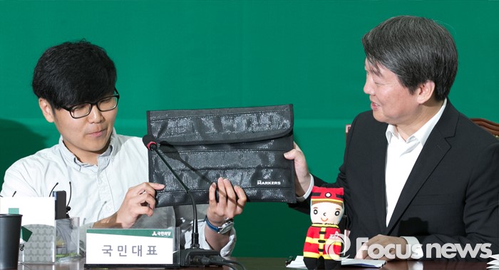 (서울=포커스뉴스) 9일 오전 서울 여의도 국회에서 열린 국민의당 최고위원회의에 참석한 안철수(오른쪽) 상임공동대표가 낡은 소방호스로 제작한 이규동 파이어마커스 대표의 제품을 살펴보고 있다.
