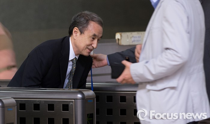 (서울=포커스뉴스) 신현우 전 옥시레킷벤키저(현 RB코리아) 대표가 9일 오전 서울중앙지방검찰청으로 들어서다 출입문에 무릎을 부딪히자 멋쩍은 웃음을 짓고 있다.