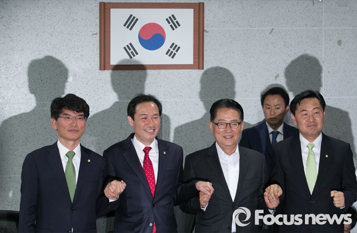 (서울=포커스뉴스) 우상호 더불어민주당 원내대표가 9일 오전 서울 여의도 국회 의원회관에서 박지원 국민의당 원내대표를 예방, 취재진을 향해 포즈를 취하고 있다. 왼쪽부터 박완주 더불어민주당 원내수석부대표, 우상호 원내대표, 박지원 국민의당 원내대표, 김관영 원내수석부대표.