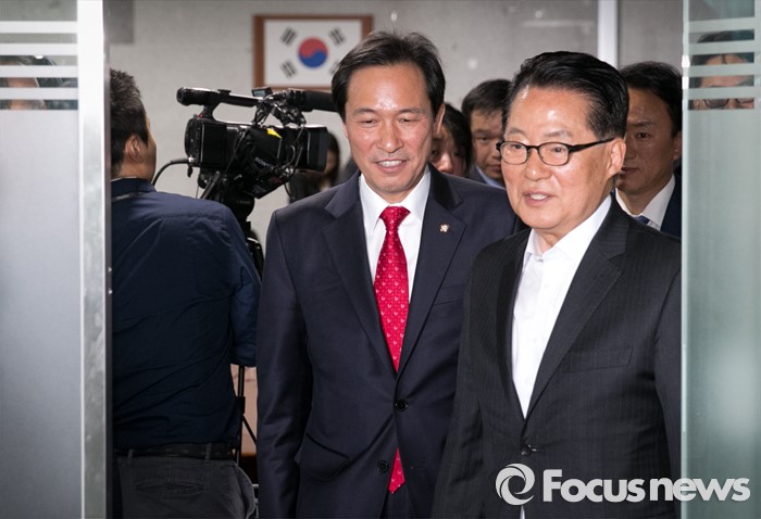 (서울=포커스뉴스) 우상호(왼쪽) 더불어민주당 원내대표가 9일 오전 서울 여의도 국회 의원회관에서 박지원 국민의당 원내대표를 예방, 면담을 마친 뒤 나서고 있다.
