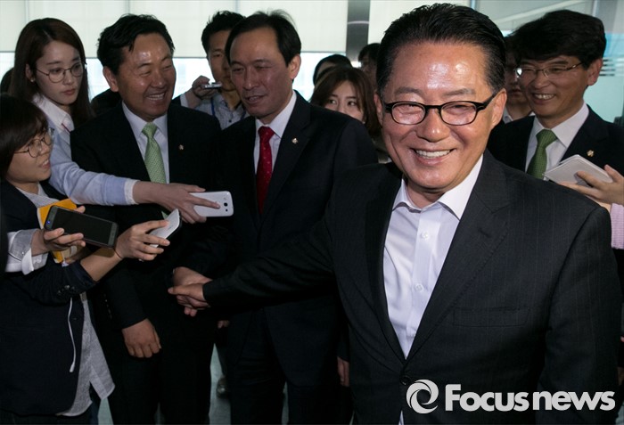 (서울=포커스뉴스) 우상호 더불어민주당 원내대표가 9일 오전 서울 여의도 국회 의원회관에서 박지원 국민의당 원내대표를 예방, 면담을 마친 뒤 나와 취재진 앞에서 대화한 뒤 이동하고 있다. 왼쪽부터 김관영 국민의당 원내수석부대표, 우상호 더불어민주당 원내대표, 박지원 국민의당 원내대표, 박완주 더불어민주당 원내수석부대표.