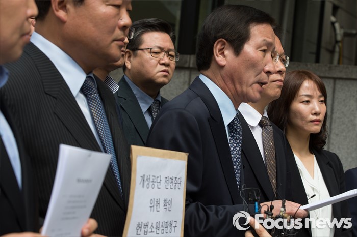 (서울=포커스뉴스) 9일 오전 서울 종로구 헌법재판소 앞에서 정기섭(오른쪽 세번째) 개성공단기업협회 회장과 개성공단 비상대책위원회 관계자들이 정부의 개성공단 전면중단 조치에 대한 위헌심판 청구서 제출에 앞서 기자회견을 하고 있다.