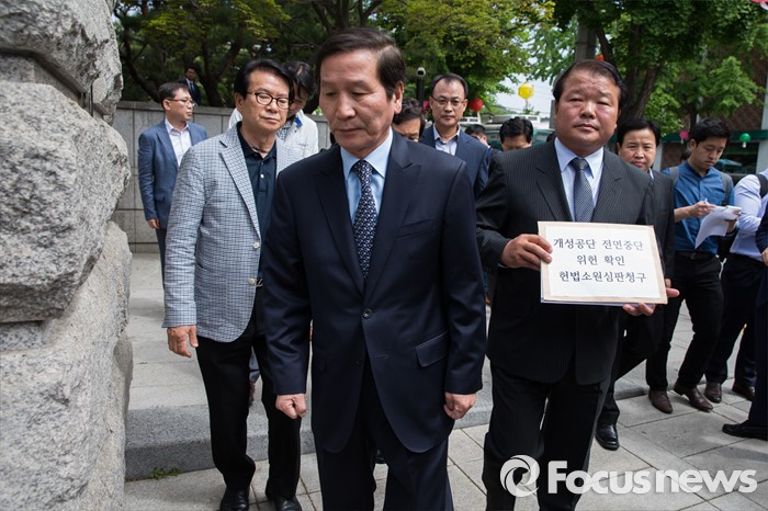 (서울=포커스뉴스) 9일 오전 서울 종로구 헌법재판소 앞에서 정기섭 개성공단기업협회 회장과 개성공단 비상대책위원회 관계자들이 정부의 개성공단 전면중단 조치에 대한 위헌심판 청구서 제출을 위해 민원실로 향하고 있다.