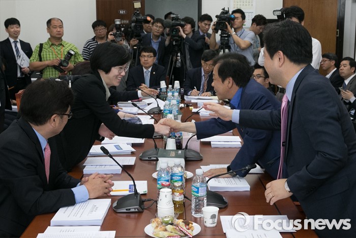 (서울=포커스뉴스) 9일 오전 서울 여의도 국회에서 열린 환경노동위원회 법안심사소위원회에 참석한 여야 의원들이 인사하고 있다. 왼쪽부터 우원식, 장하나 더불어민주당 의원, 이완영, 김용남 새누리당 의원. 이날 환노위 법안소위는 가습기살균제의 흡입독성 화학물질에 의한 피해구제에 관한 법률안 및 가습기살균제피해구제법률안 등을 심사할 예정이다.