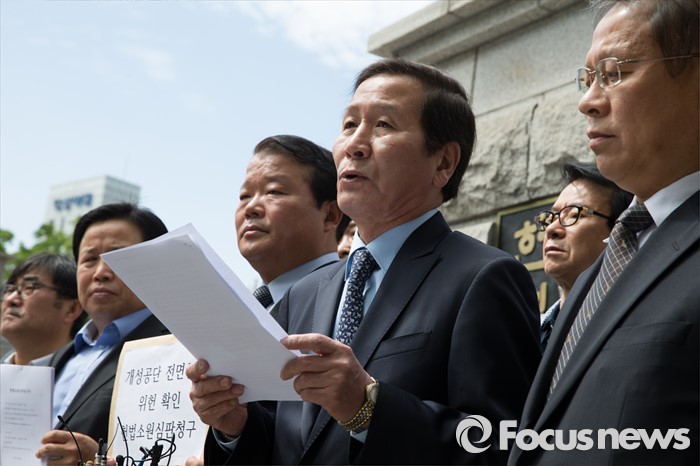 (서울=포커스뉴스) 9일 오전 서울 종로구 헌법재판소 앞에서 정기섭 개성공단기업협회 회장과 개성공단 비상대책위원회 관계자들이 정부의 개성공단 전면중단 조치에 대한 위헌심판 청구서 제출에 앞서 기자회견을 하고 있다.