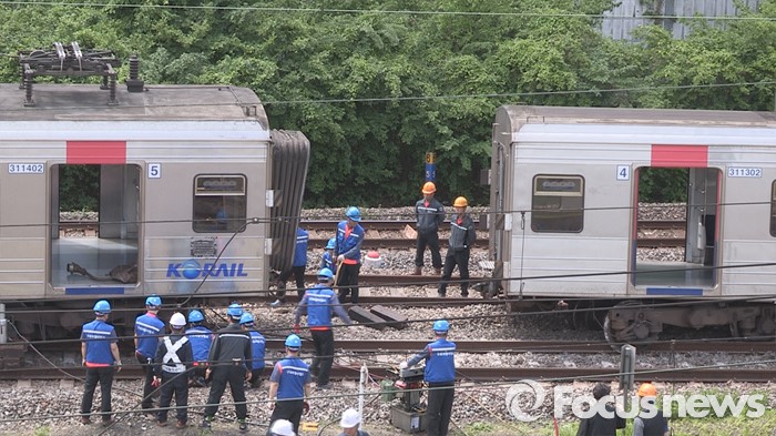 (서울=포커스뉴스) 9일 오전 서울 노량진역에서 경인선 급행열차가 탈선해, 코레일 직원들이 복구작업을 벌이고 있다. 이 사고로 구로역에서 용산역까지 5개구간 급행열차의 운행이 중단됐으며, 부상자는 없는 것으로 알려졌다. <사진=포커스뉴스 영상 캡쳐>