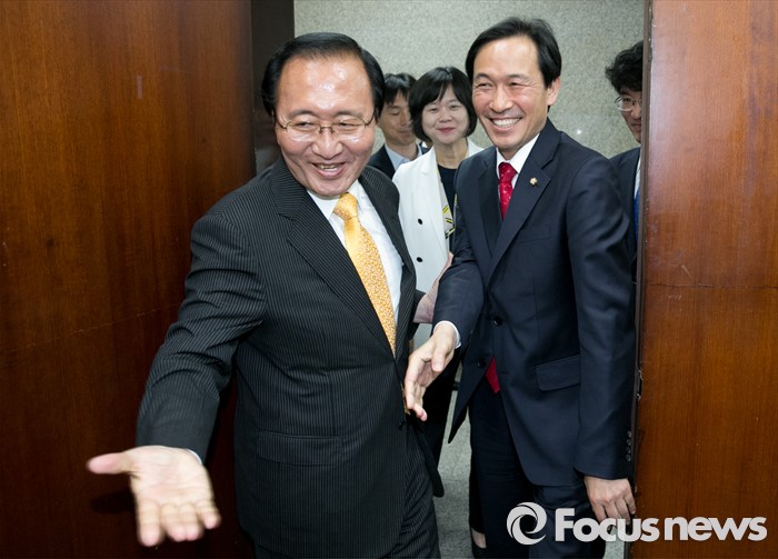 (서울=포커스뉴스) 우상호(오른쪽) 더불어민주당 원내대표가 9일 오전 서울 여의도 국회에서 노회찬 정의당 원내대표를 예방, 인사하고 있다.