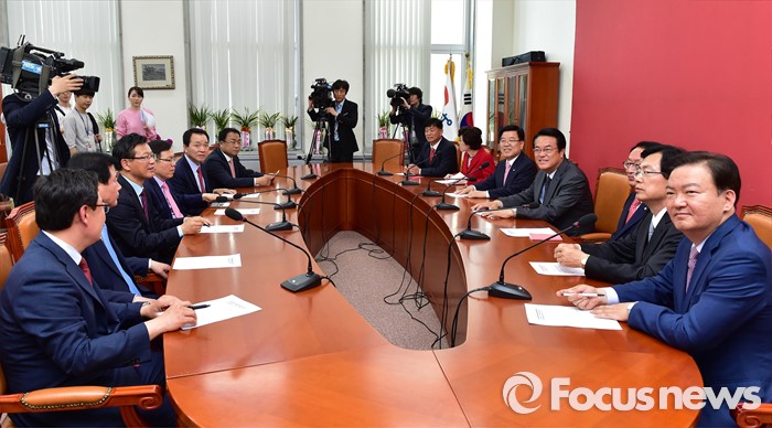 (서울=포커스뉴스) 정진석 새누리당 원내대표가 9일 오전 서울 여의도 국회에서 열린 신임 원내대표단과의 티타임에 참석해 모두발언을 하고 있다.