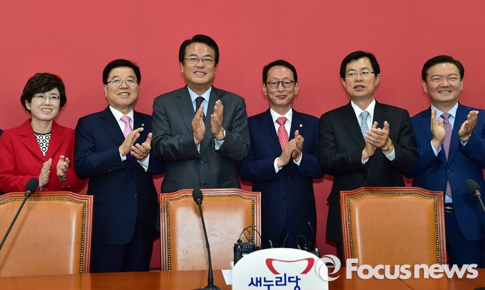 (서울=포커스뉴스) 정진석(왼쪽 세번째) 새누리당 원내대표가 9일 오전 서울 여의도 국회에서 열린 신임 원내대표단과의 티타임에 참석해 의원들과 함께 박수치고 있다.
