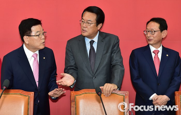 (서울=포커스뉴스) 정진석(가운데) 새누리당 원내대표가 9일 오전 서울 여의도 국회에서 신임 원내대표단과의 티타임에 앞서 김광림(왼쪽) 정책위의장과 대화하고 있다. 오른쪽은 김도읍 원내수석부대표.