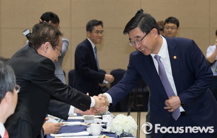(세종=포커스뉴스) 이기권(오른쪽) 고용노동부 장관이 9일 오후 세종시 정부세종컨벤션센터에서 열린 노동시장 전략회의에서 참석자와 인사를 하고 있다.