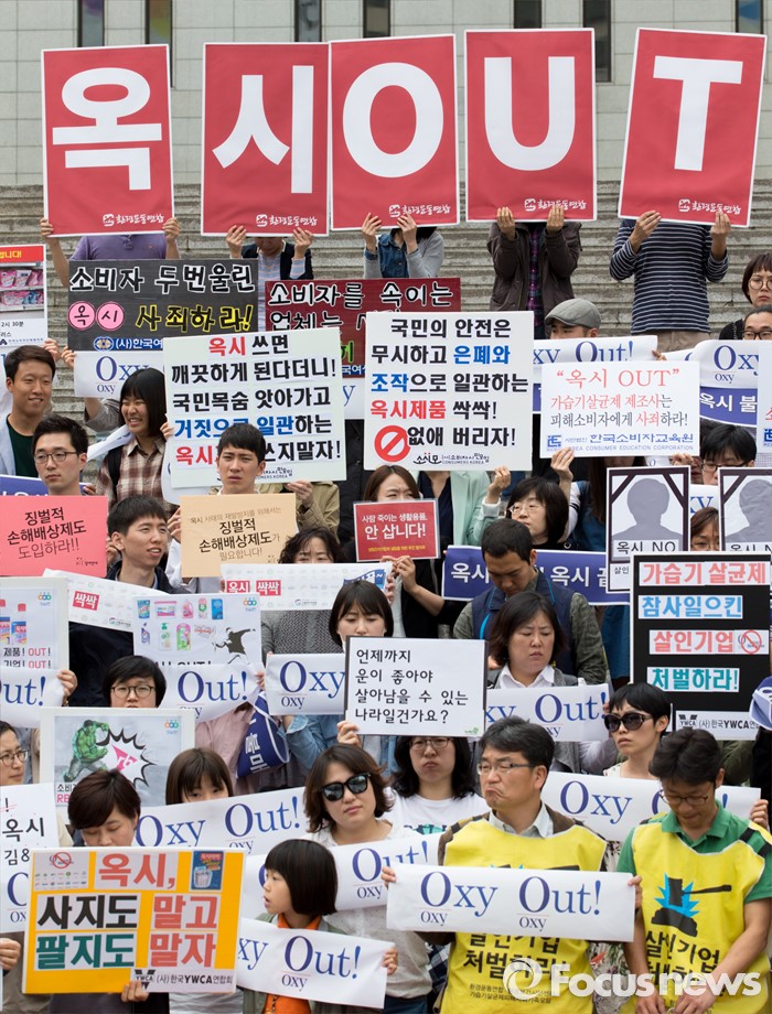 (서울=포커스뉴스) 9일 오후 서울 종로구 세종문화회관 앞 계단에서 환경운동연합 및 시민사회단체들이 옥시 불매 집중 행동 돌입선언 기자회견을 하고 있다.