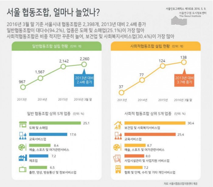 서울시내 협동조합은 지난 2013년 1004개에서 2014년 1644개로 늘어났으며 지난해에는 2266개까지 늘어났다.