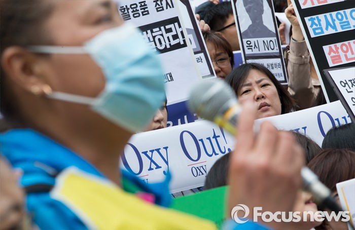 (서울=포커스뉴스) 9일 오후 서울 종로구 세종문화회관 앞 계단에서 환경운동연합 및 시민사회단체들이 옥시 불매 집중 행동 돌입선언 기자회견을 하고 있다.