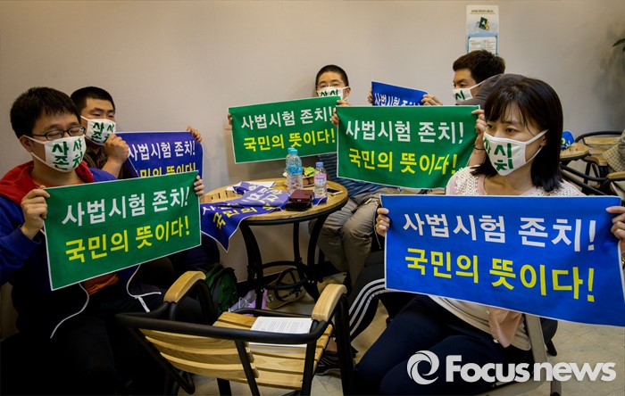 (서울=포커스뉴스) 9일 오후 서울 마포구 국민의당 당사에서 '사법시험존치를 위한 고시생 모임' 소속 학생들이 사시 존치를 요구하는 펼침막을 들고 안철수 상임공동대표를 기다리고 있다. '사법시험존치를 위한 고시생 모임'에서 활동하는 수험생 6명은 이날 오전 국민의당 당사 회의실을 점거, 기자회견을 열고 안 대표와의 면담을 요청했다.