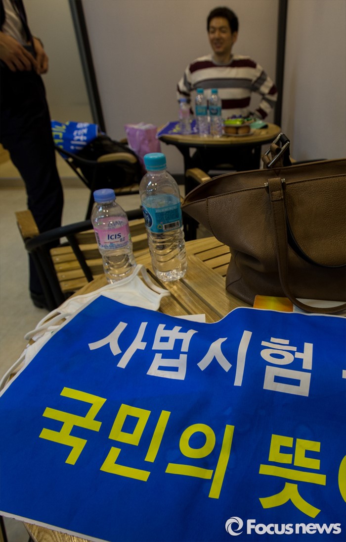 (서울=포커스뉴스) 9일 오후 서울 마포구 국민의당 당사에서 '사법시험존치를 위한 고시생 모임' 소속 학생이 사시 존치를 요구하는 펼침막을 탁자 위에 펼쳐놓고 있다. '사법시험존치를 위한 고시생 모임'에서 활동하는 수험생 6명은 이날 오전 국민의당 당사 회의실에서 기자회견을 열고 안철수 국민의당 상임공동대표와 면담을 요청했다.