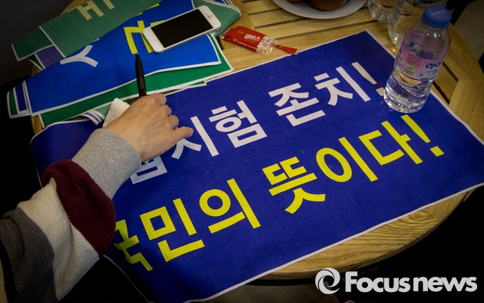 (서울=포커스뉴스) 9일 오후 서울 마포구 국민의당 당사에서 '사법시험존치를 위한 고시생 모임' 소속 학생이 사시 존치를 요구하는 펼침막을 탁자 위에 펼쳐놓고 있다. '사법시험존치를 위한 고시생 모임'에서 활동하는 수험생 6명은 이날 오전 국민의당 당사 회의실에서 기자회견을 열고 안철수 국민의당 상임공동대표와 면담을 요청했다.