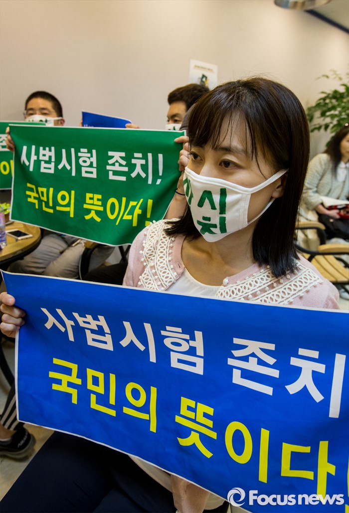 (서울=포커스뉴스) 9일 오후 서울 마포구 국민의당 당사에서 '사법시험존치를 위한 고시생 모임' 소속 학생들이 사시 존치를 요구하는 펼침막을 들고 안철수 상임공동대표를 기다리고 있다. '사법시험존치를 위한 고시생 모임'에서 활동하는 수험생 6명은 이날 오전 국민의당 당사 회의실을 점거, 기자회견을 열고 안 대표와의 면담을 요청했다.
