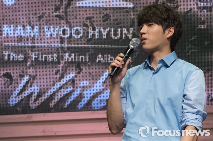 (서울=포커스뉴스) 9일 오후 서울 광진구 예스24라이브홀에서 열린 첫 솔로 미니앨범 발매 기념 프레스 쇼케이스에서 인피니트의 가수 남우현이 사회자의 질문에 답변을 하고 있다.