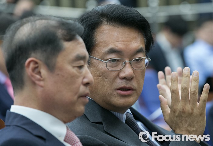 (서울=포커스뉴스) 정진석(오른쪽) 새누리당 원내대표가 9일 오후 서울 여의도 국회에서 열린 20대 총선 당선자 총회에 참석해 특강자로 나선 노무현 정부 청와대 정책실장 출신인 김병준 국민대 교수와 대화하고 있다.