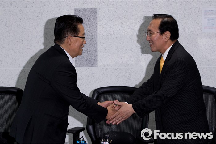 (서울=포커스뉴스) 박지원(왼쪽) 국민의당 원내대표와 노회찬 정의당 원내대표가 9일 오후 서울 여의도 국회에서 면담에 앞서 악수하고 있다.