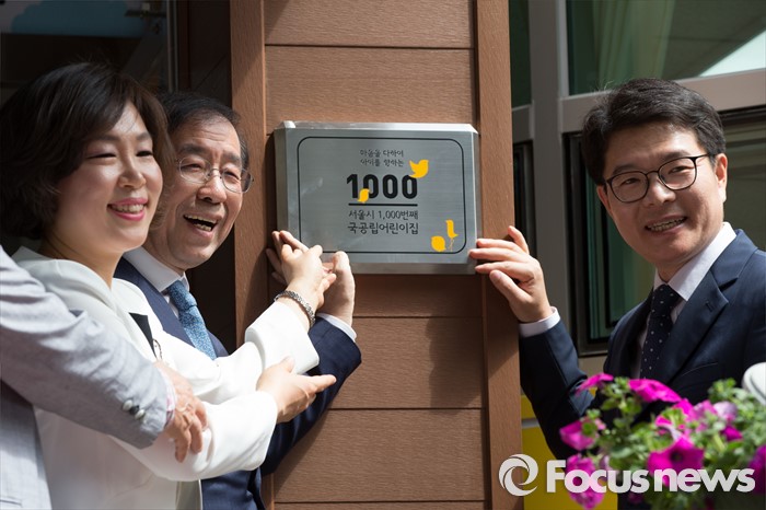 (서울=포커스뉴스) 9일 오후 서울 성동구 송정햇살어린이집에서 열린 서울시 1000번째 국공립어린이집 개원식에 박원순(왼쪽 두번째) 서울시장과 정원오 성동구청장, 참석내빈이 현판식을 하고 있다.