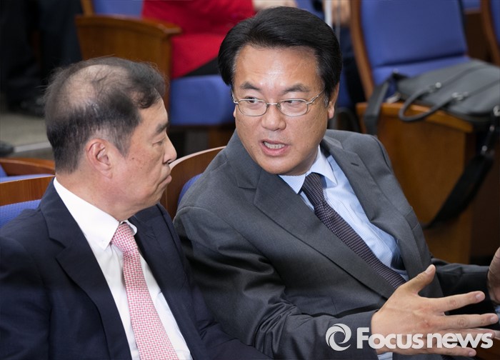 (서울=포커스뉴스) 9일 오후 서울 여의도 국회에서 열린 새누리당 20대 총선 당선자 총회에 참석한 정진석(오른쪽) 원내대표와 특강자로 나선 노무현 정부 청와대 정책실장 출신 김병준 국민대 교수가 대화하고 있다.