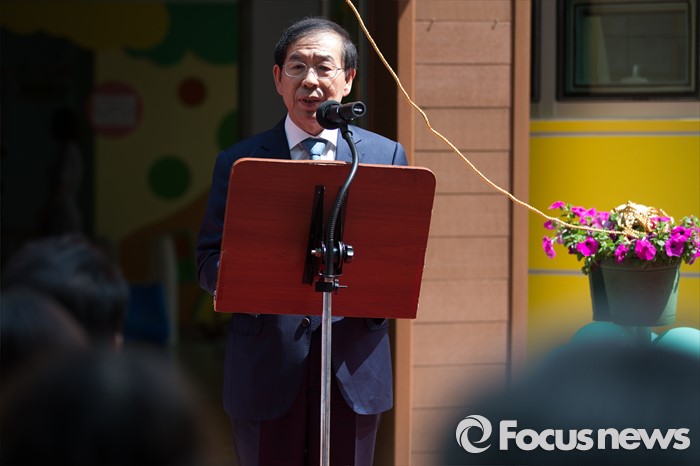 (서울=포커스뉴스) 9일 오후 서울 성동구 송정햇살어린이집에서 열린 서울시 1000번째 국공립어린이집 개원식에서 박원순 서울시장이 축사를 하고 있다.