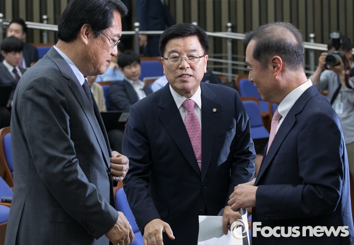 (서울=포커스뉴스) 9일 오후 서울 여의도 국회에서 열린 새누리당 20대 총선 당선자 총회에 참석한 정진석(왼쪽부터) 원내대표, 김광림 정책위의장, 특강자로 나선 노무현 정부 청와대 정책실장 출신 김병준 국민대 교수가 대화하고 있다.