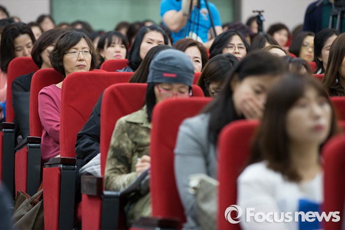 (서울=포커스뉴스) 9일 오후 서울 송파구 아이코리아에서 열린 '보육교직원 결의대회'에 참석한 보육관계자들이 박원순 서울시장의 축사를 듣고 있다.