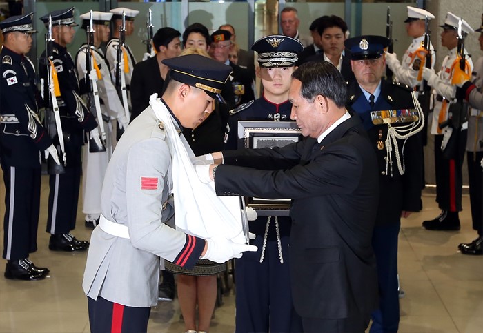 (서울=포커스뉴스) 박승춘 국가보훈처장이 9일 오후 인천국제공항에 도착한 6.25전쟁 네덜란드 참전용사 故 니콜라스 프란스 웨셀(Nicolas Frans Wessels)씨의 유해에 양국 국기가 새겨진 감사와 경의의 증표를 전달하고 있다. 6·25전쟁에 네덜란드 반호이츠 부대원(일병)으로 참전한 故 니콜라스 프란스 웨셀씨는 1953년 11월에 한국을 떠났지만 자신이 목숨바쳐 지켰던 한국에 대한 애정이 아주 컸으며, 평소 부산 UN기념공원에 묻힌 전우들을 그리워하다 지난해 4월 7일 "한국에 있는 전우들 곁에 잠들게 해 달라"는 유언을 남긴 채 향년 84세의 일기로 삶을 마감했다. 지난해 5월 부산 UN기념공원에 프랑스 참전용사 故 레몽 베나르씨가 사후 안장 실시된 이후 4번째인 웨셀 씨는 오는 12일 오전 부산UN기념공원에 안장된다. <사진제공=국가보훈처>