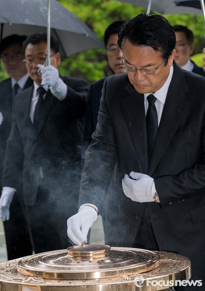 (서울=포커스뉴스) 10일 오전 서울 동작구 국립현충원을 찾은 정진석 새누리당 신임 원내대표가 분향하고 있다.