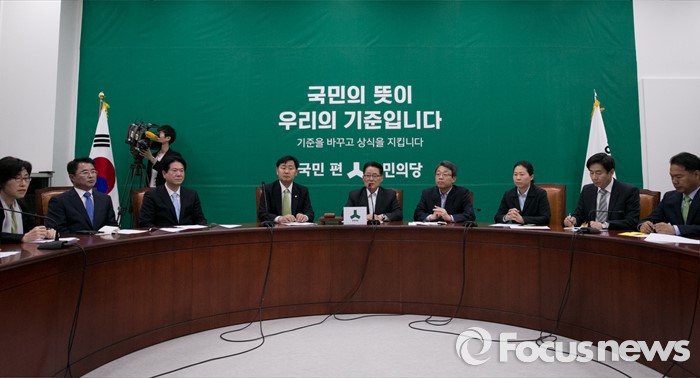 (서울=포커스뉴스) 박지원(왼쪽 다섯번째) 국민의당 원내대표가 10일 오전 서울 여의도 국회에서 열린 원내대책회의에 참석해 발언하고 있다.