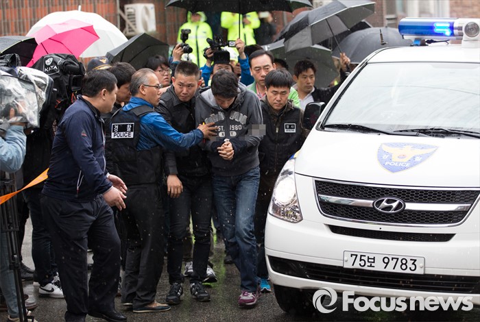 (인천=포커스뉴스) 안산 대부도 토막살인의 용의자 조성호가 10일 오전 인천 연수구 연수동의 주거지에서 현장검증을 위해 범행현장으로 이동하고 있다.