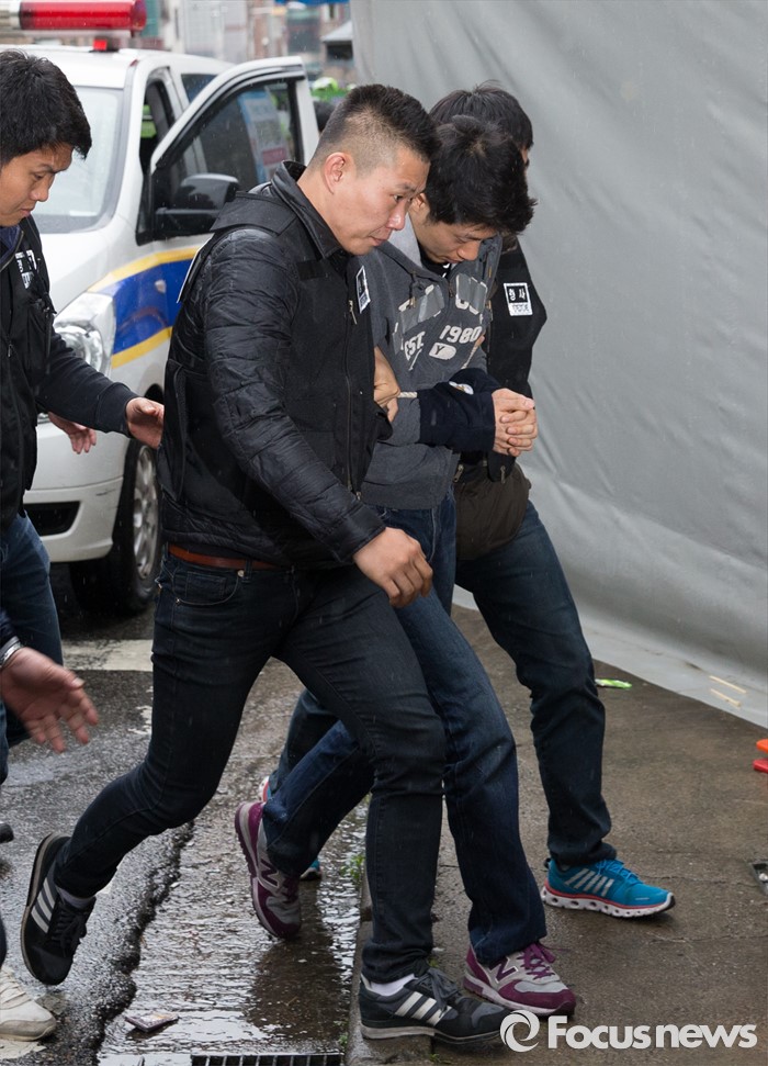 (인천=포커스뉴스) 안산 대부도 토막살인의 용의자 조성호가 10일 오전 인천 연수구 연수동의 주거지에서 현장검증을 위해 범행현장으로 이동하고 있다.