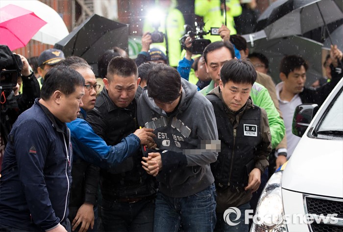 (인천=포커스뉴스) 안산 대부도 토막살인의 용의자 조성호가 10일 오전 인천 연수구 연수동의 주거지에서 현장검증을 위해 범행현장으로 이동하고 있다.
